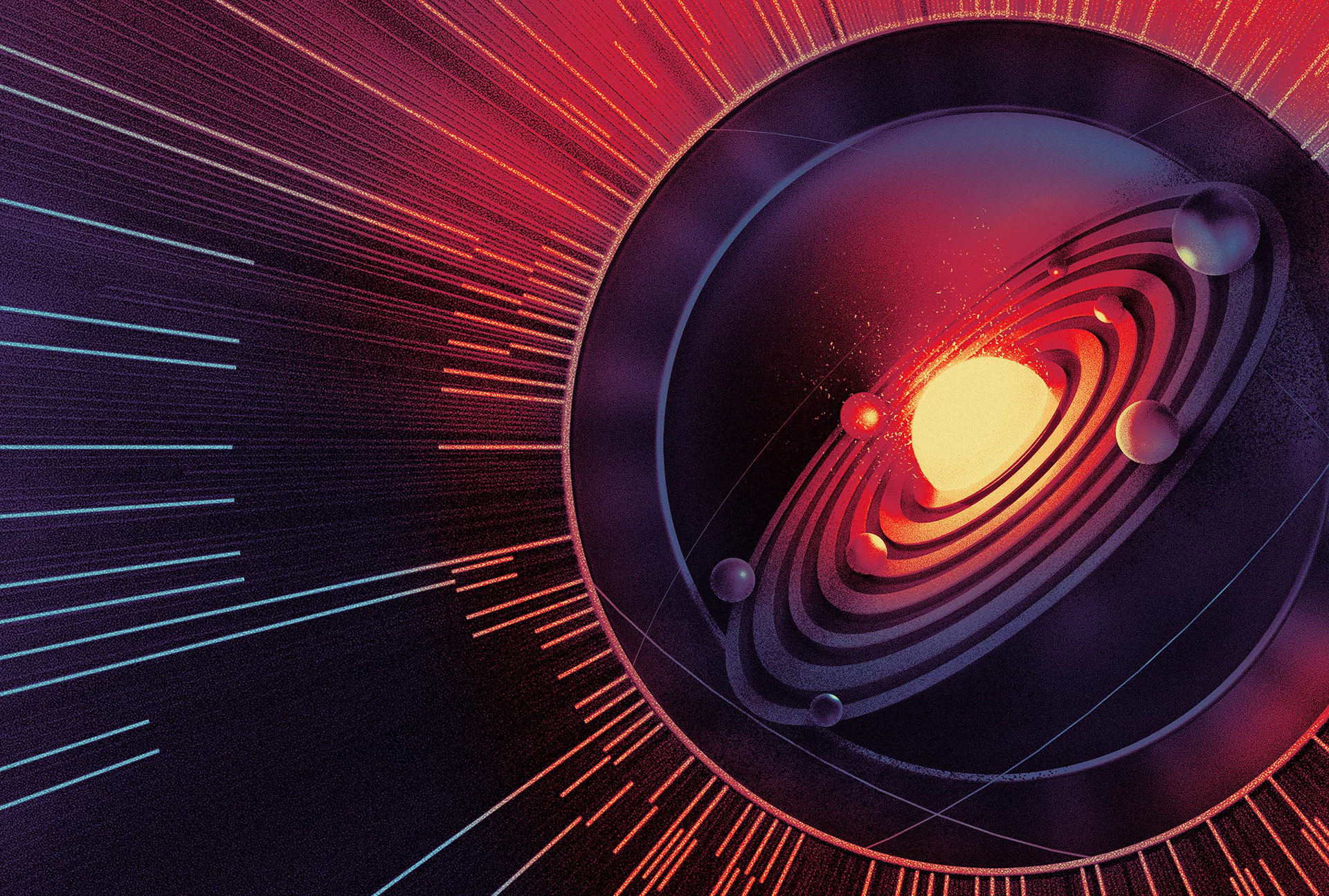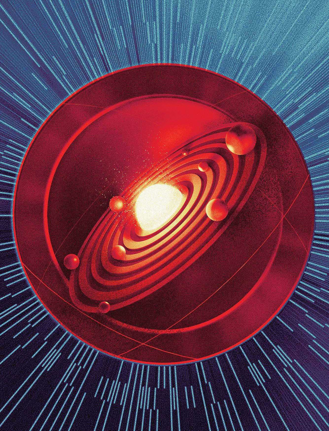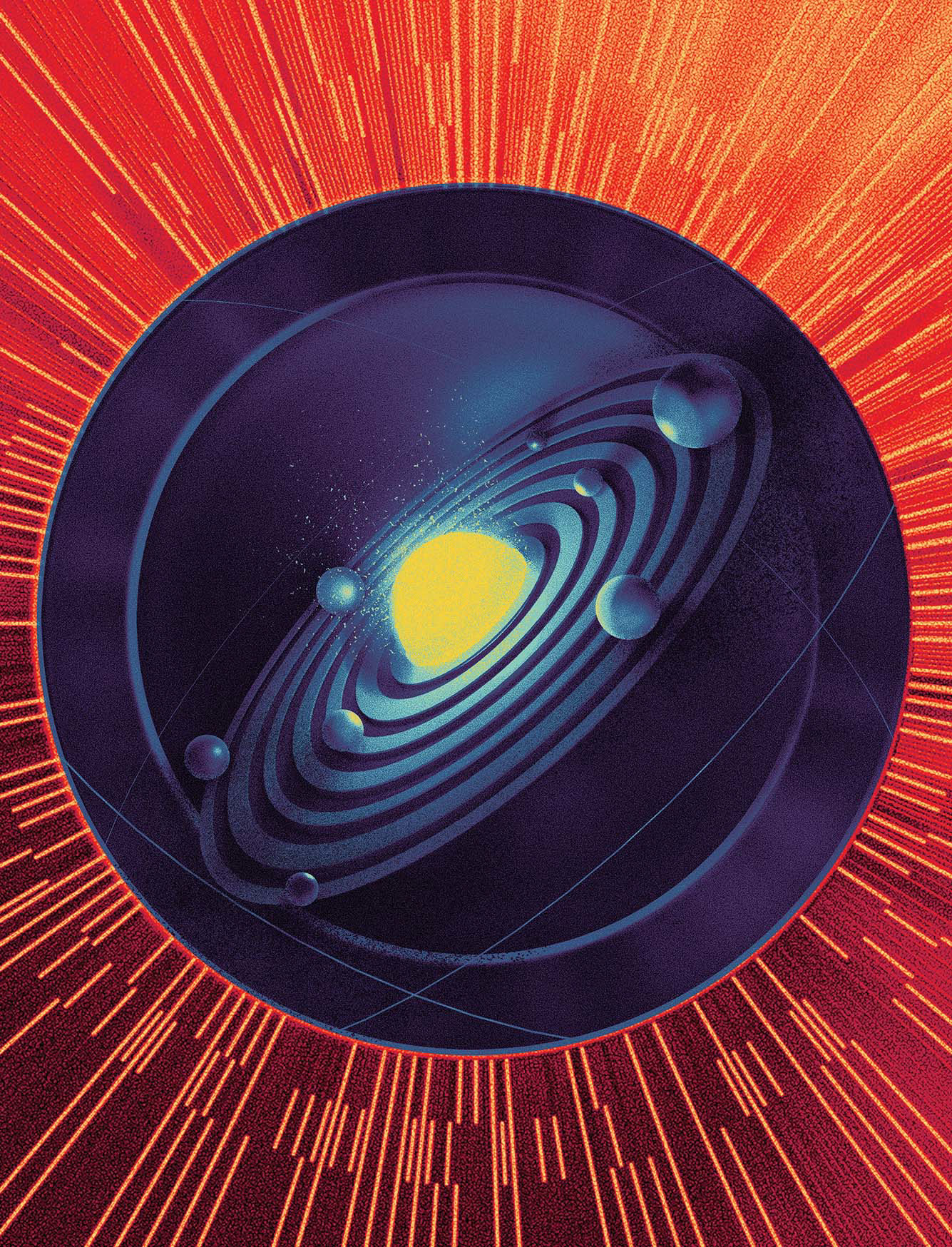 This is the spread illustration that opens the article. It's a stylised orrery (love that word!) sat within the protective cradle of the heliosphere, with cosmic rays being neutralised at the heliosphere's edge.