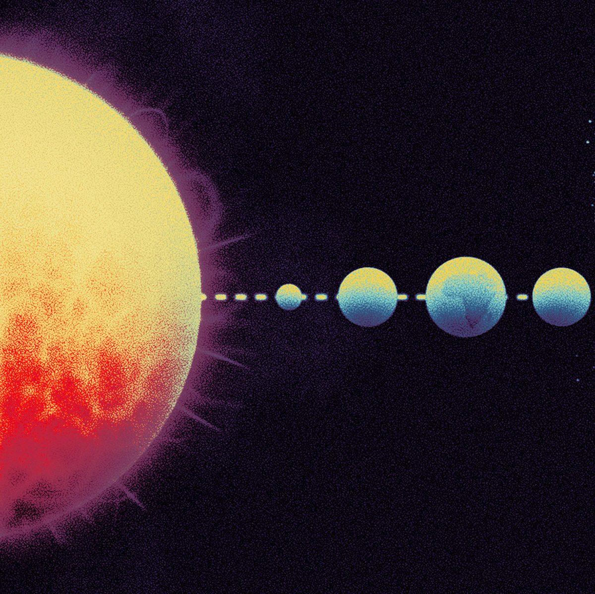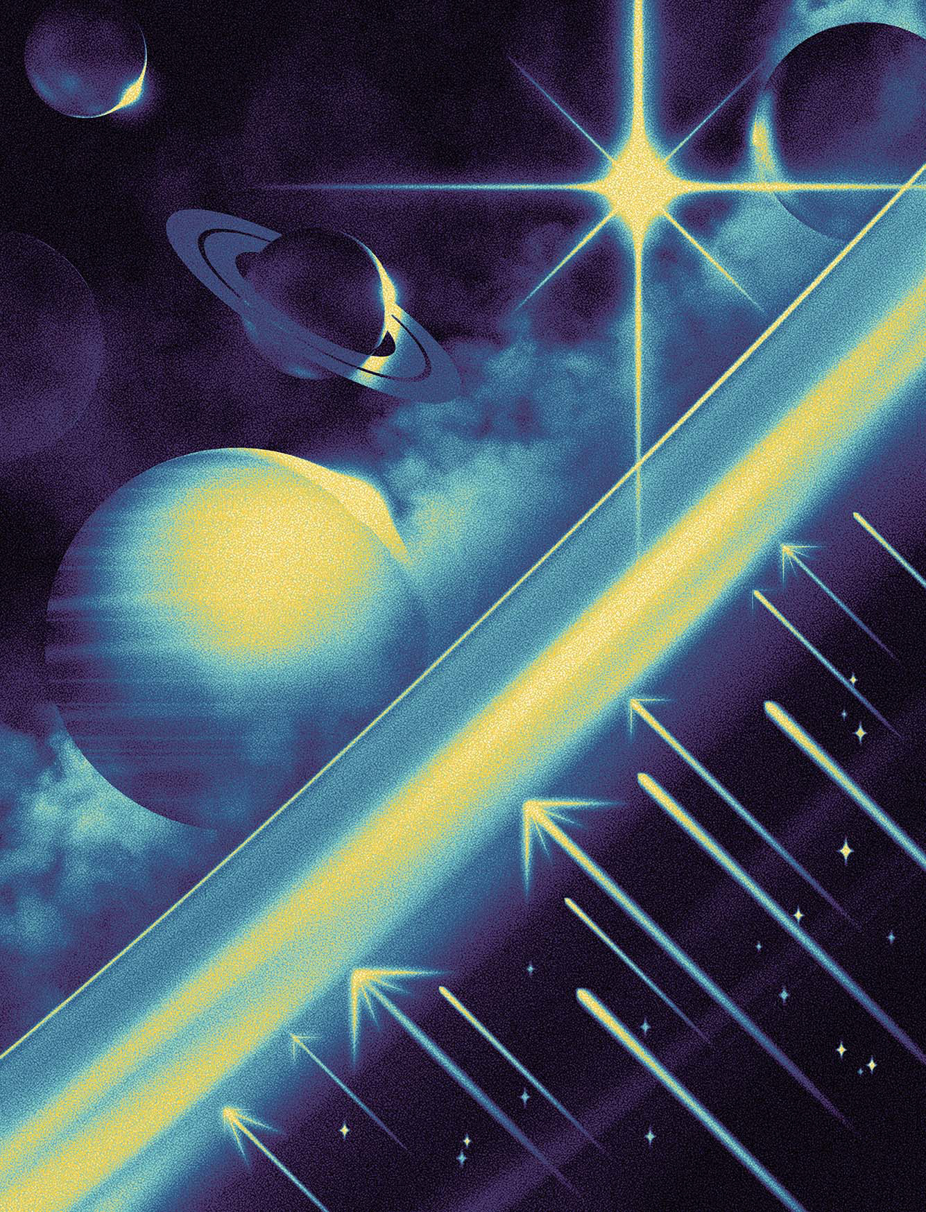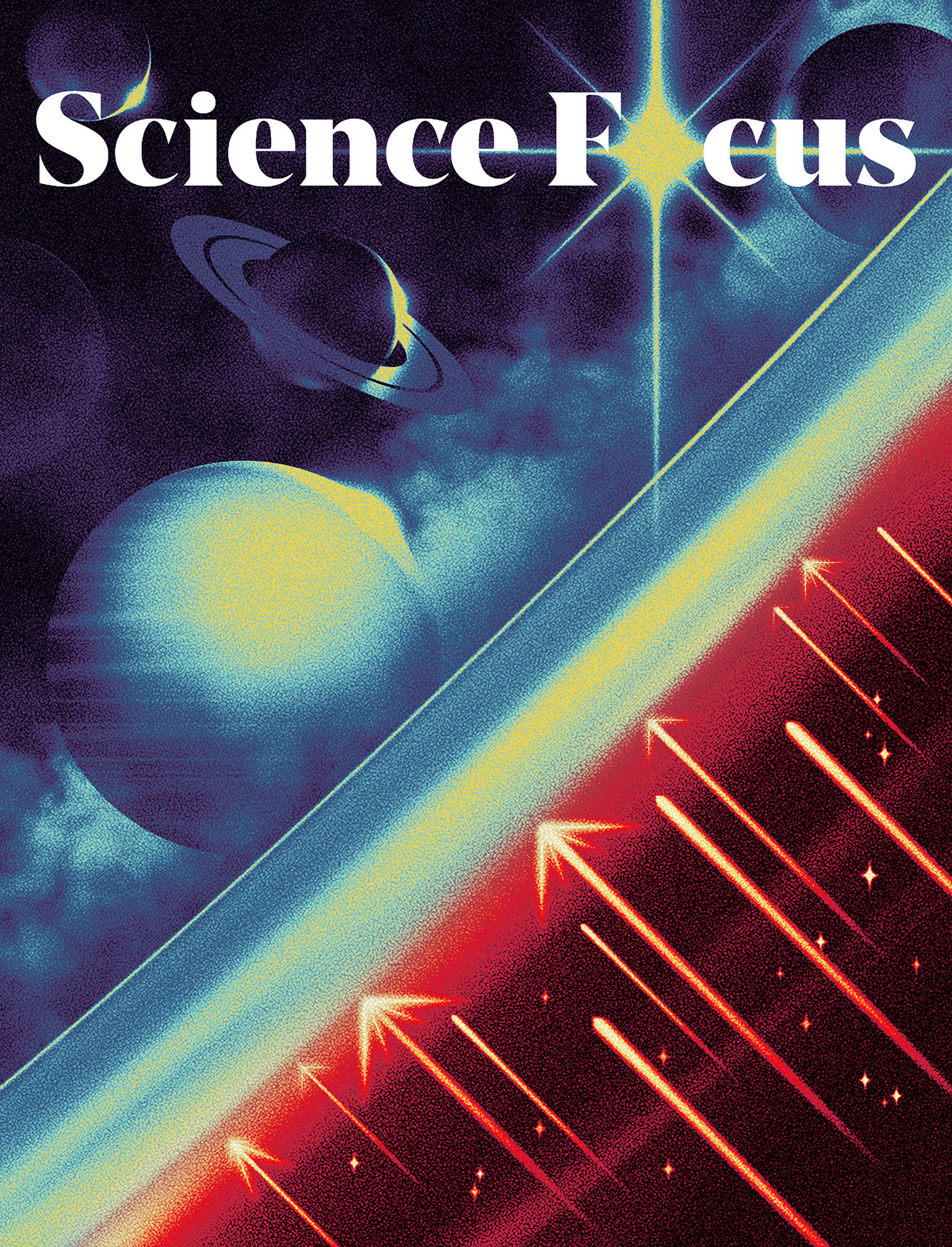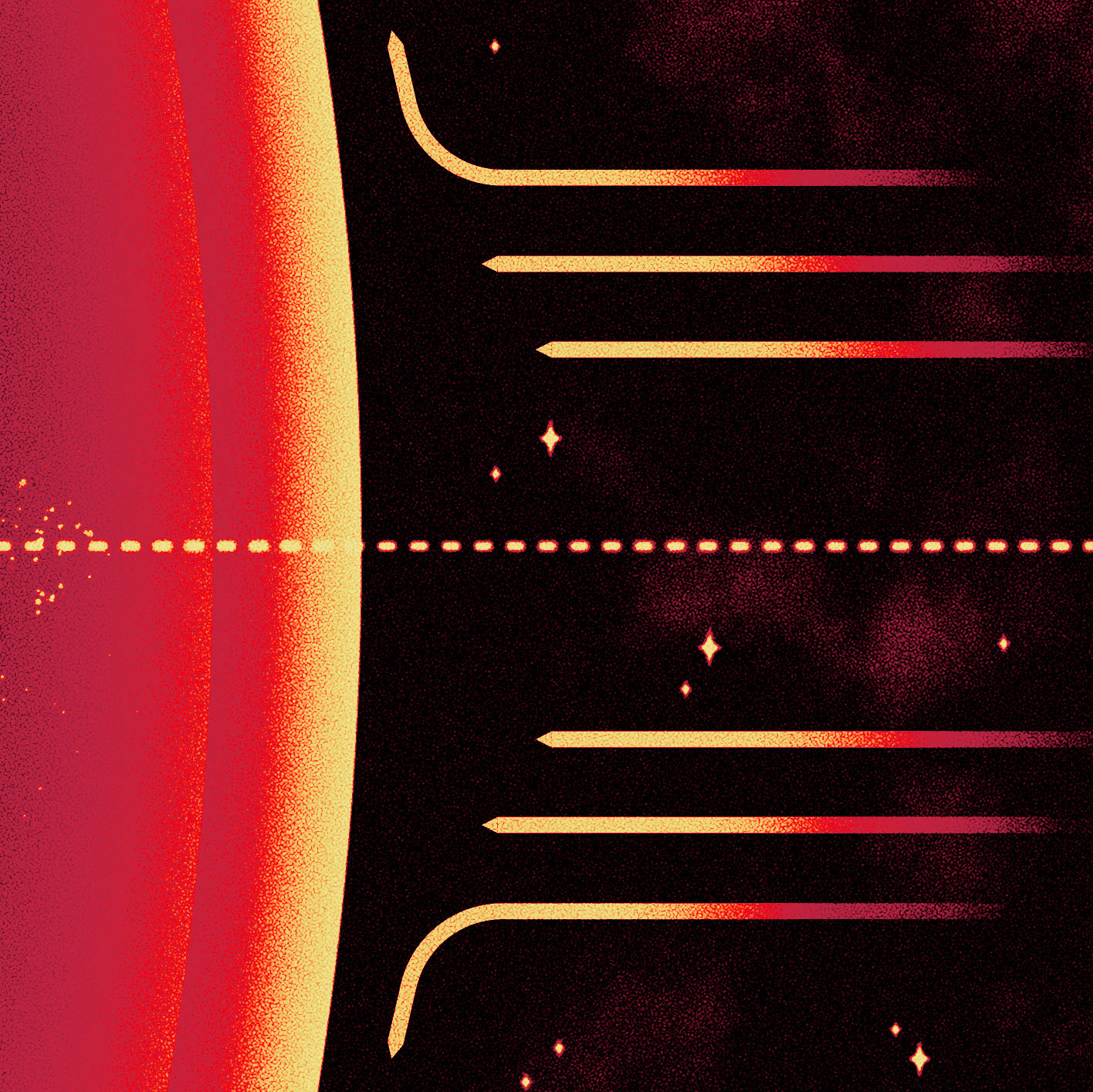 This is the spread illustration that opens the article. It's a stylised orrery (love that word!) sat within the protective cradle of the heliosphere, with cosmic rays being neutralised at the heliosphere's edge.