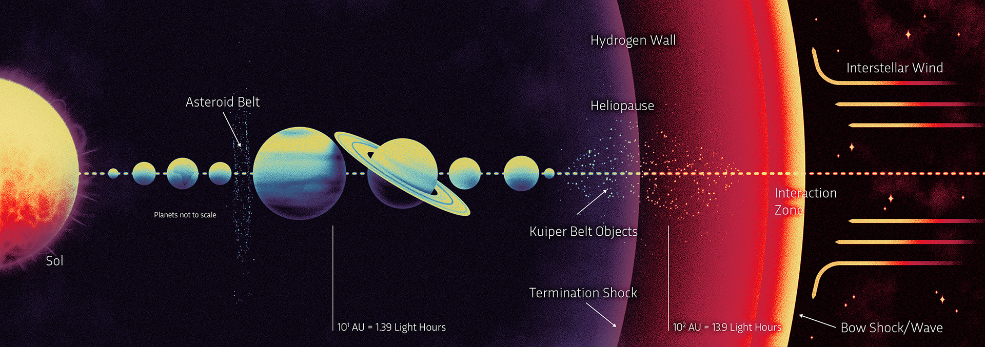 This diagram illustrates the position of the solar system within the heliosphere and how it's protected from interstellar wind. This is based on an original NASA illustration.
