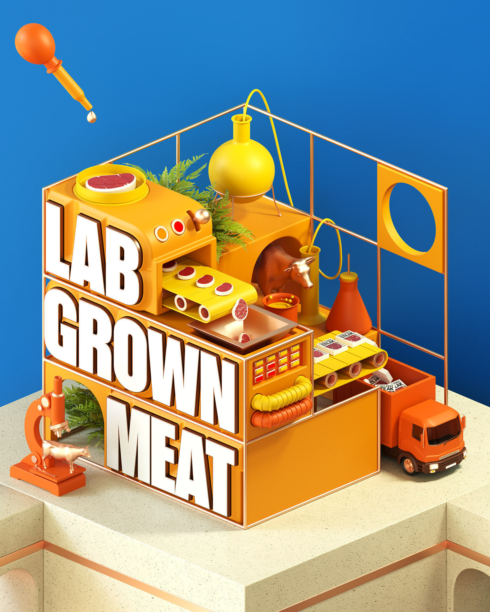 Cover illustration and animation for BBC Science Focus. The subject here was an interesting one: lab grown meat. For this I built a kind of lab/factory combo within a little isometric block. The plan from the get-go was to design something that would lend itself to being animated and looped ad infinitum. The original tagline for this one read: "Everything you need to know about a future where we can have our steak and eat it" – which was bit more fun!