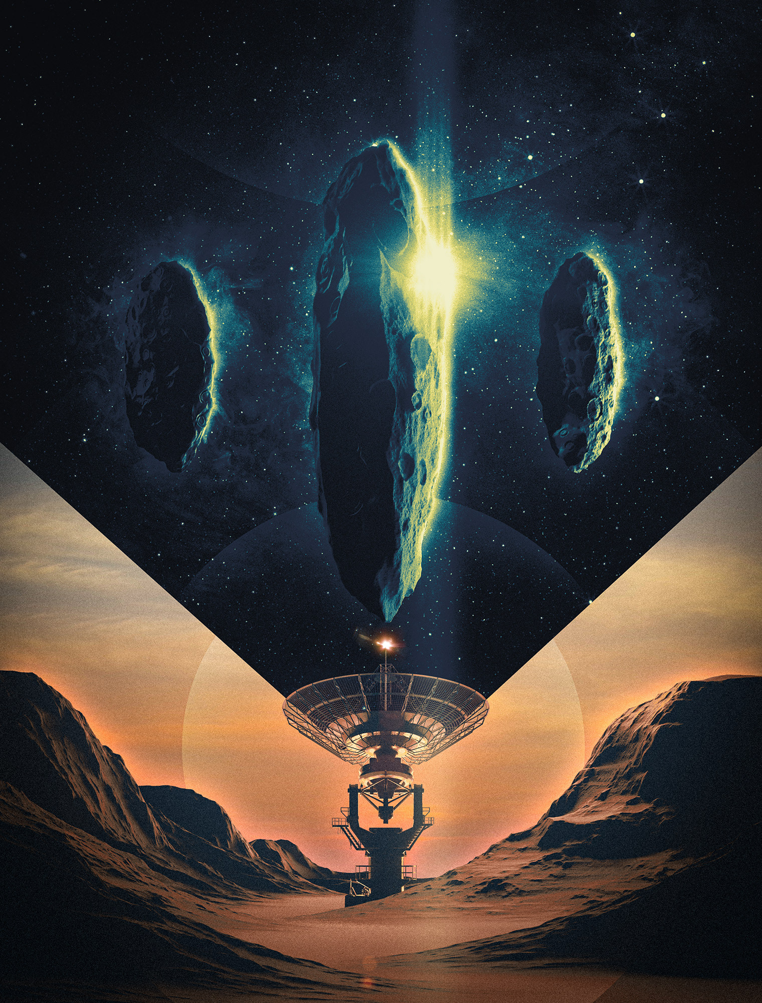 The idea here was to create a strong graphic composition showing both a radio telescope on Earth and some mysterious asteroids.
