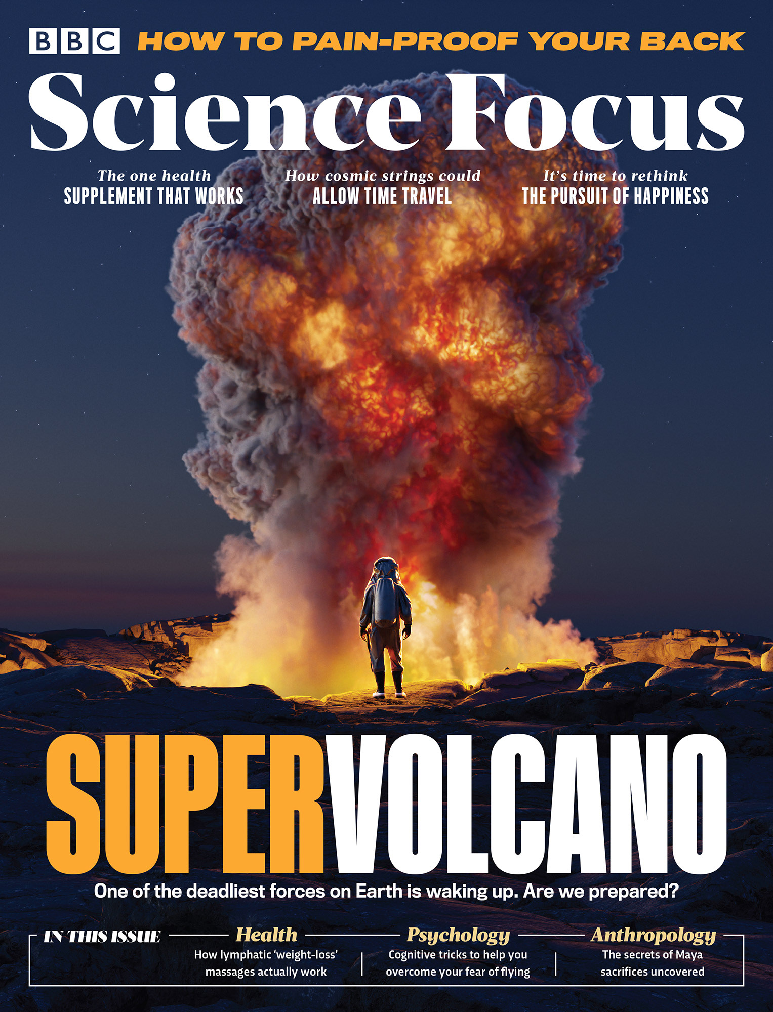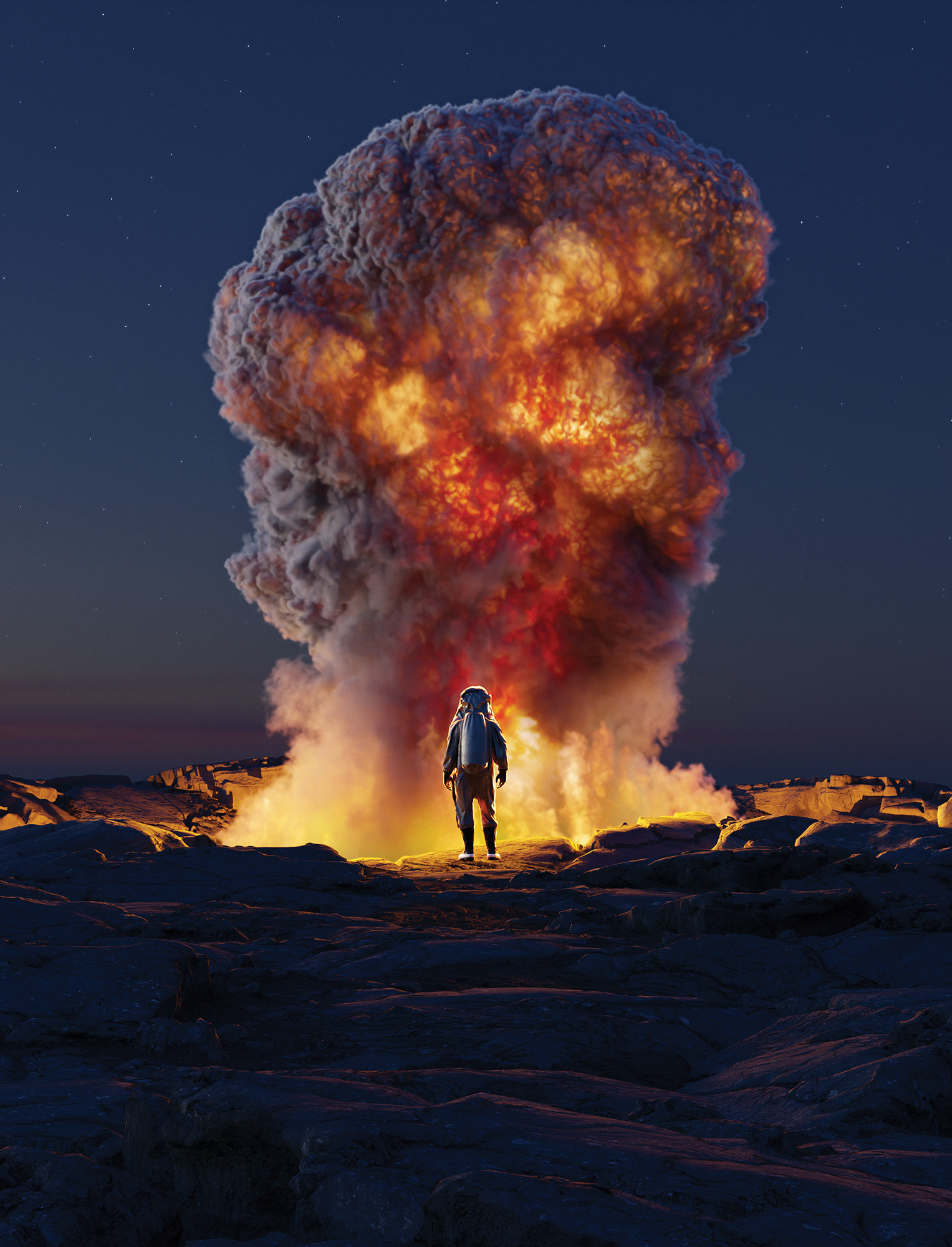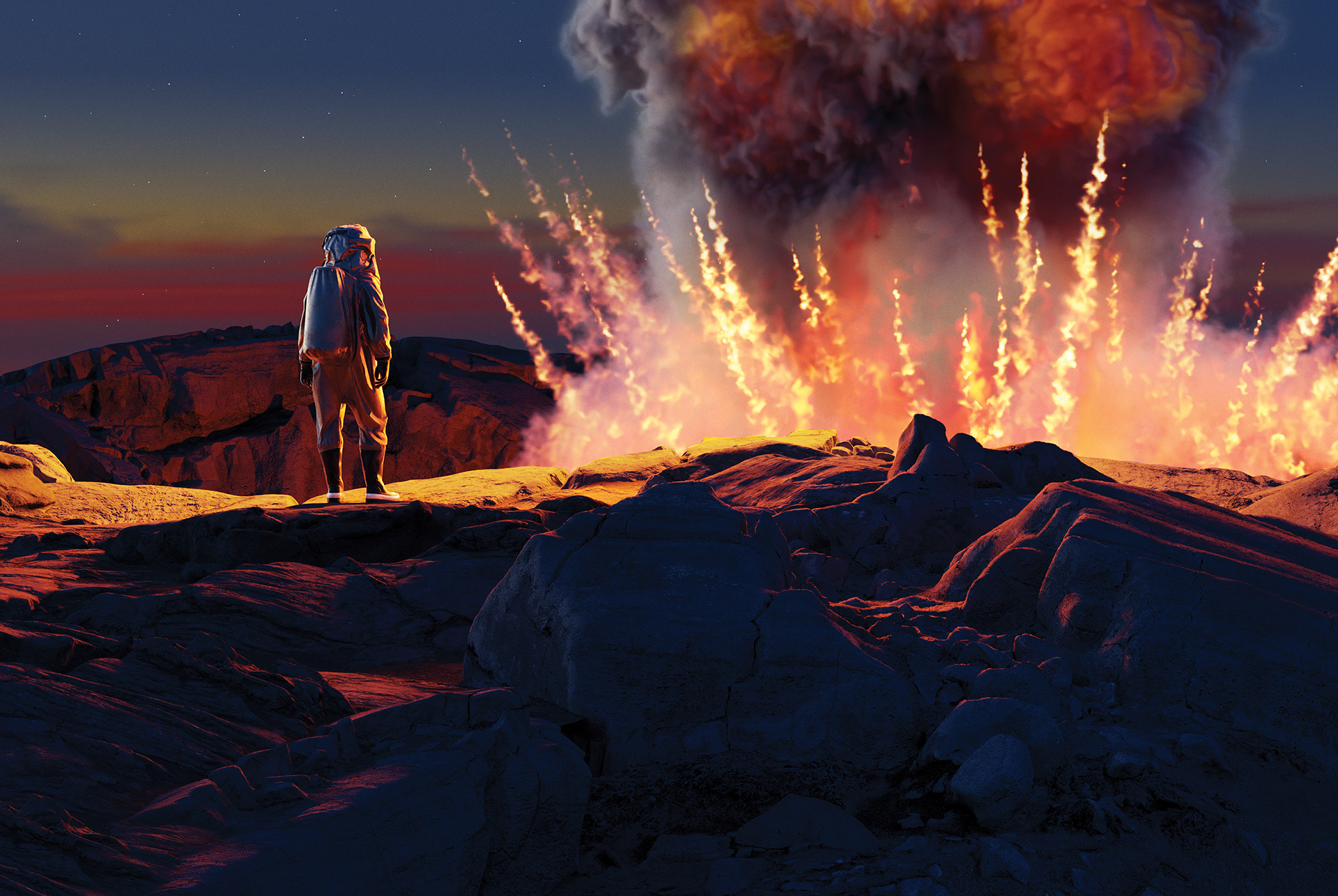 Cover illustration for print and animated version for Apple News+ edition. A vulcanologist in a fireproof suit watches on as a giant plume of fire and smoke is emitted from a volcano.