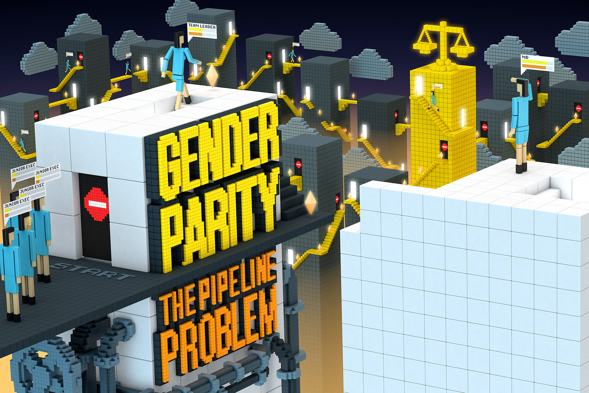 Process images. Top: sketches for both pieces. Bottom left: discarded direction that was much sunnier with a Rainbow Islands vibe. Bottom right: early experiments with voxels.